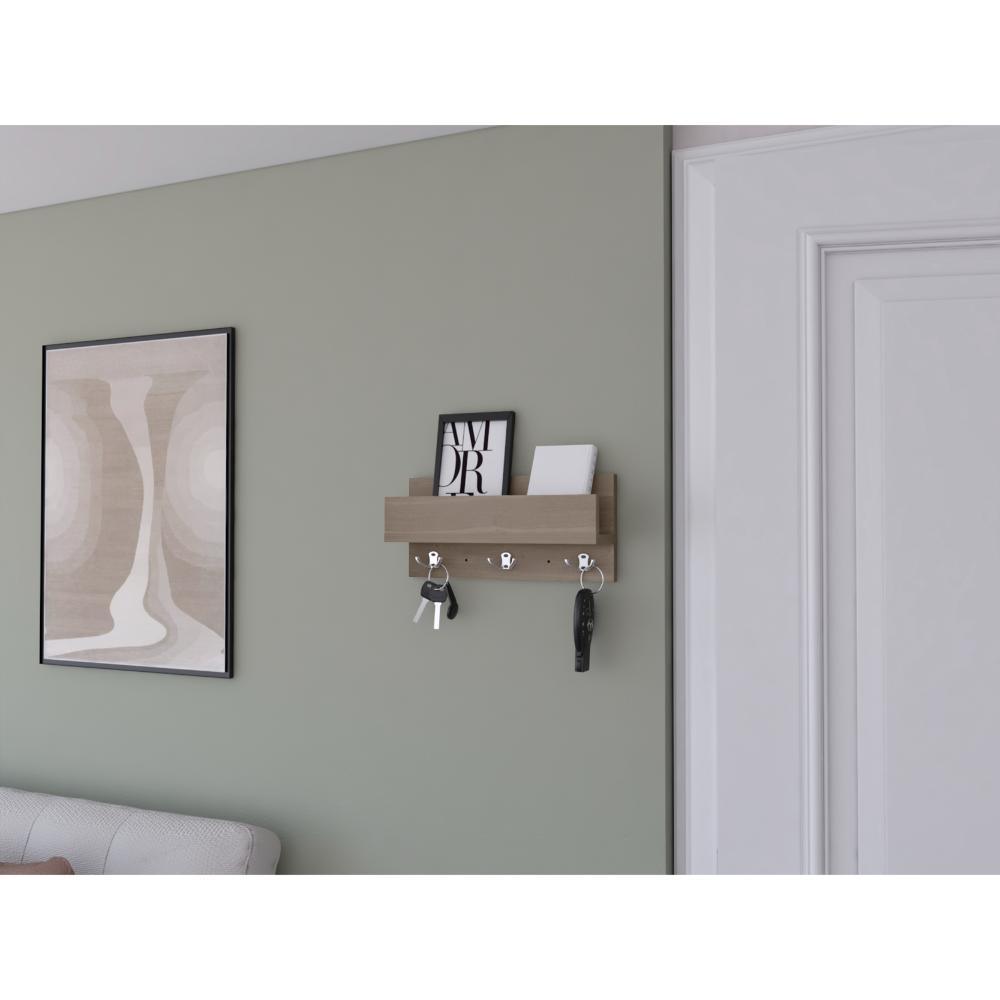 Repisa con 3 ganchos para colgar llaves o accerios y poner el celular; no requiere armado, incluye chazos para instalación a pared.