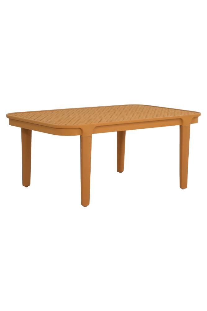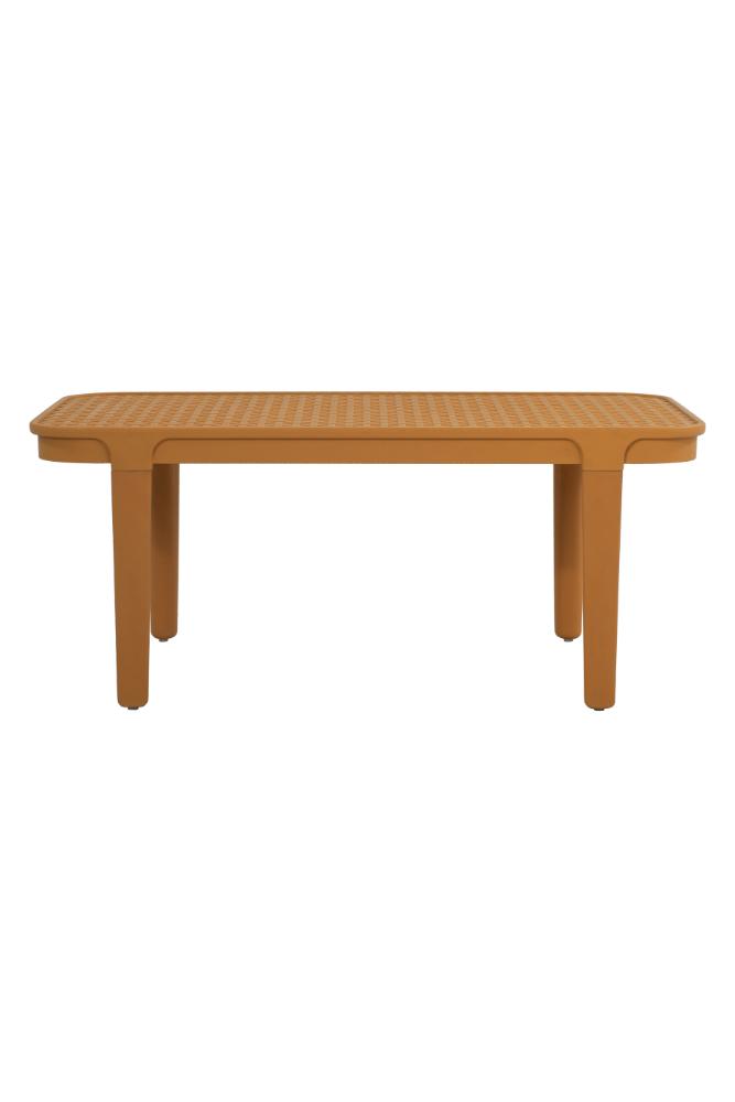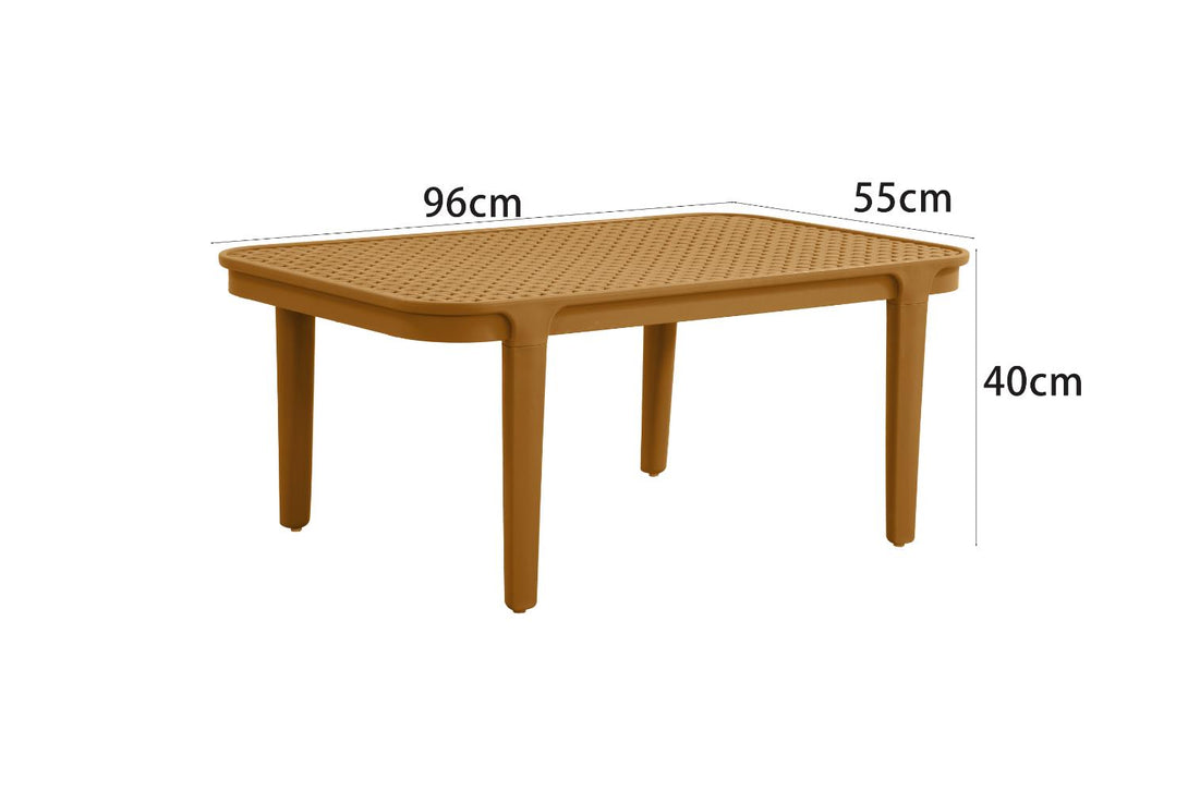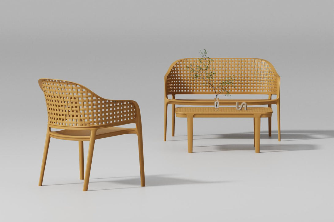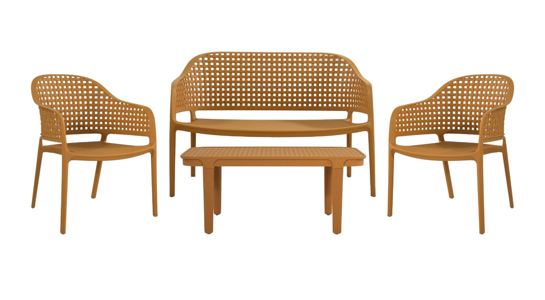 Elaborado en Polipropileno y protección a los rayos UV el set incluye mesa centro, dos sillas y un banco, en Color Naraja