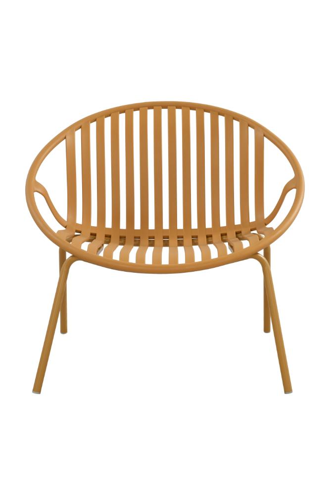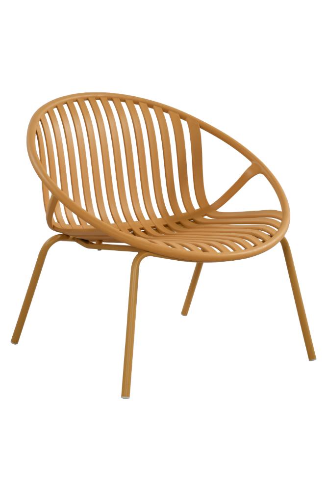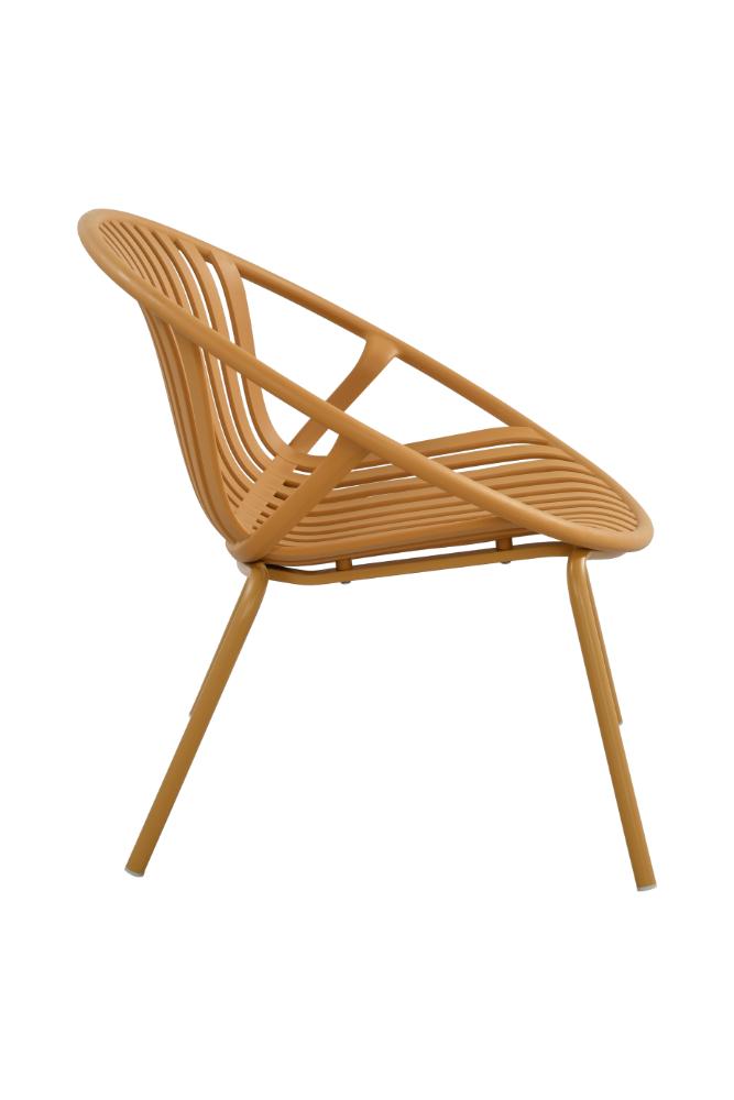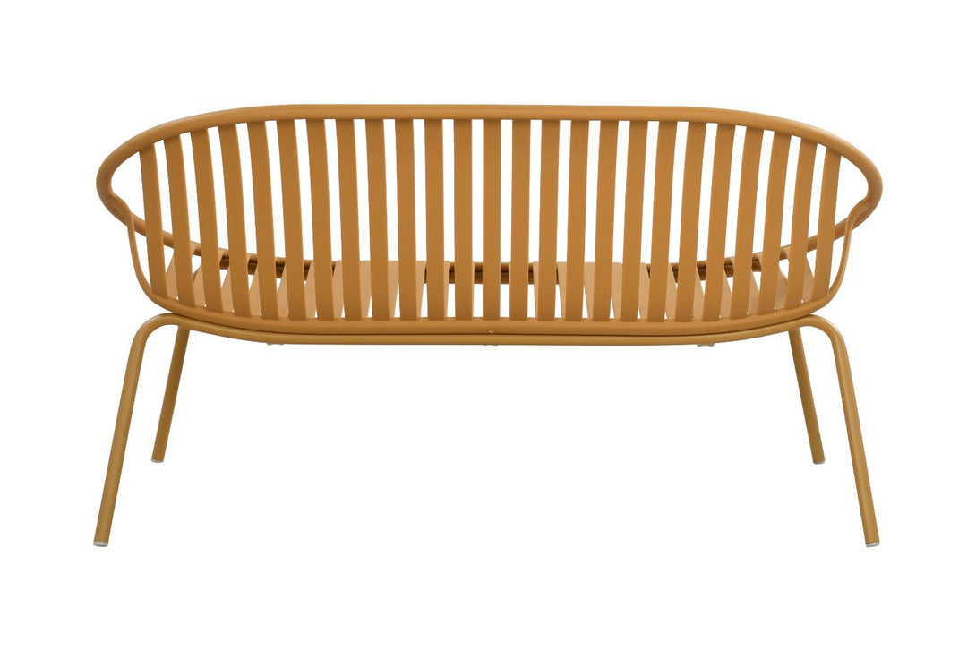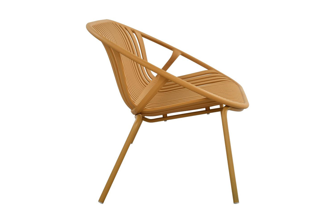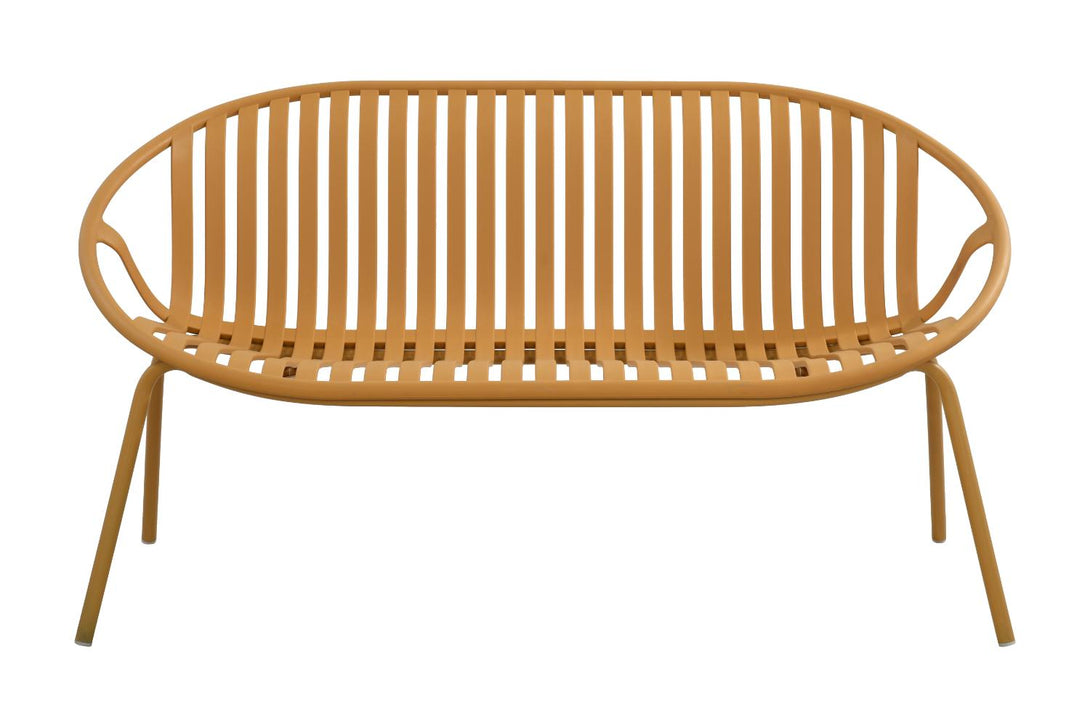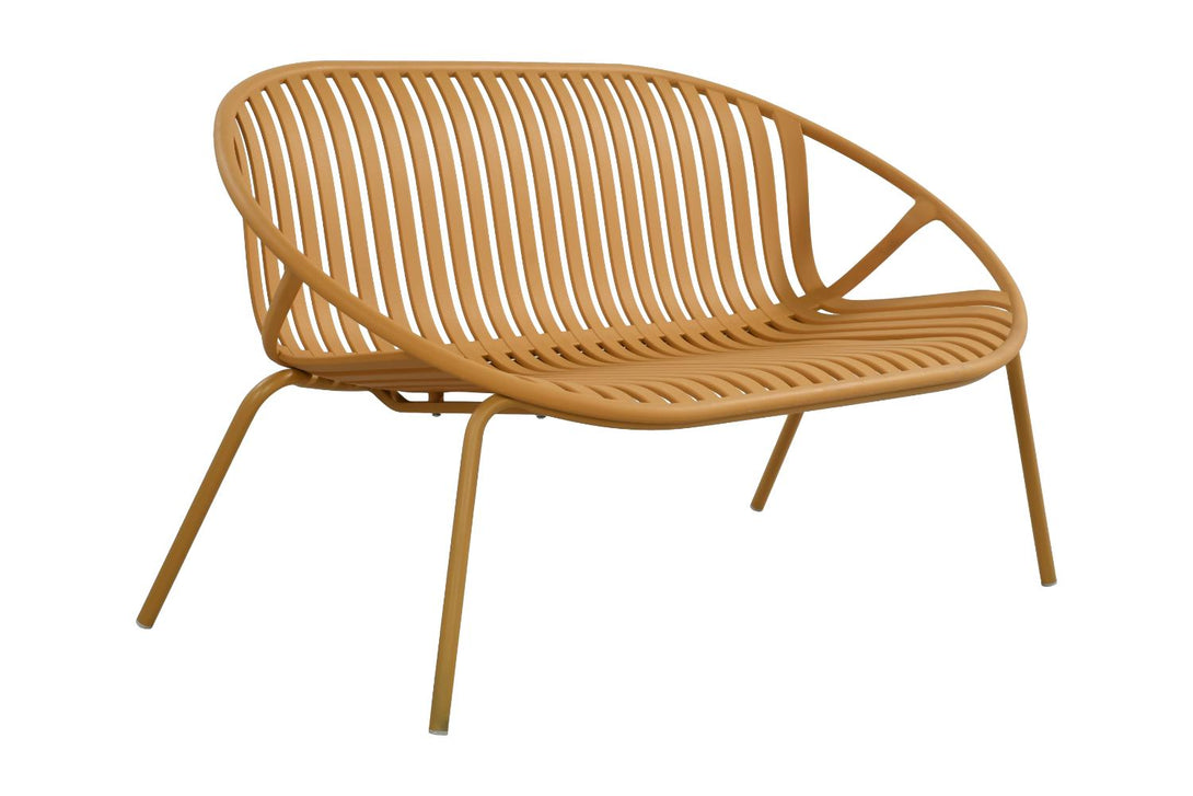 Elaborado en Polipropileno y protección a los rayos UV el set incluye mesa centro, dos sillas y un banco en patas metalicas, en Color Naranja