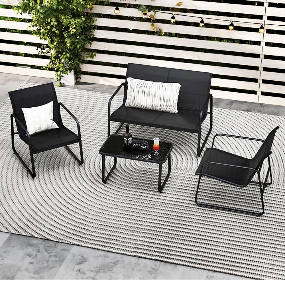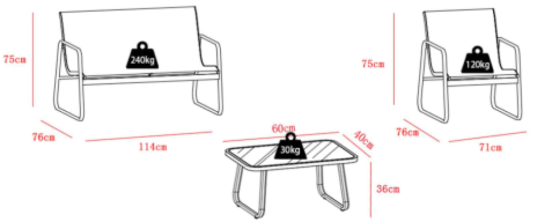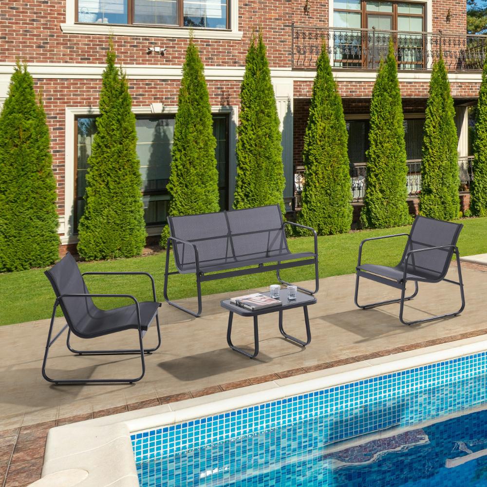Elaborado en Rattan, Plástico el set incluye mesa centro, dos sillas y un banco, en Color Gris oscuro